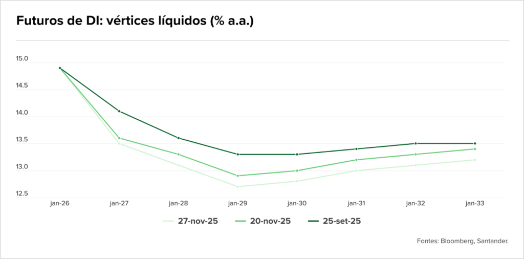 A curva de juros captou o recado. Os futuros de DI tiveram deslocamento para baixo ao longo de toda a estrutura, com a precificação indicando Selic ao redor de 12% no final de 2026 — ante 12,25% na semana anterior. A probabilidade de corte já em janeiro? 64%, segundo as últimas leituras. O mercado projeta início do ciclo de afrouxamento em breve, com Selic terminal de 2026 em 12,50%.