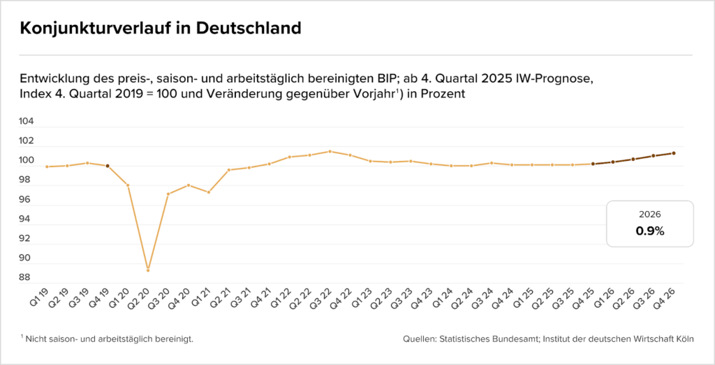 Die Grafik unten aus einer aktuellen IW-Studie zeigt, wie das preis-, saison- und arbeitstäglich bereinigte BIP nach dem pandemischen Einbruch nur schrittweise zum Vorkrisenniveau zurückkehrt. Ab dem 4. Quartal 2025 deutet sich eine leichte, aber fragile Erholung an. Für 2026 rechnet das IW mit lediglich +0,9 % Wachstum, was den anhaltenden Gegenwind unterstreicht.