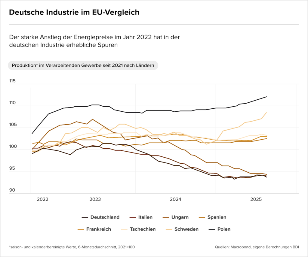 Das unten gezeigte BDI-Diagramm aus dem Industriebericht Dezember 2025 verdeutlicht diese Divergenz: Während Polen und Schweden ihre Industrieproduktion seit 2021 deutlich steigern, rutscht Deutschland kontinuierlich ab und bildet im EU-Feld inzwischen das Schlusslicht. Die Grafik illustriert somit, wie weit die Schere zwischen Deutschland und seinen Wettbewerbern inzwischen auseinandergeht und wie dringend strukturelle Reformen erforderlich sind.