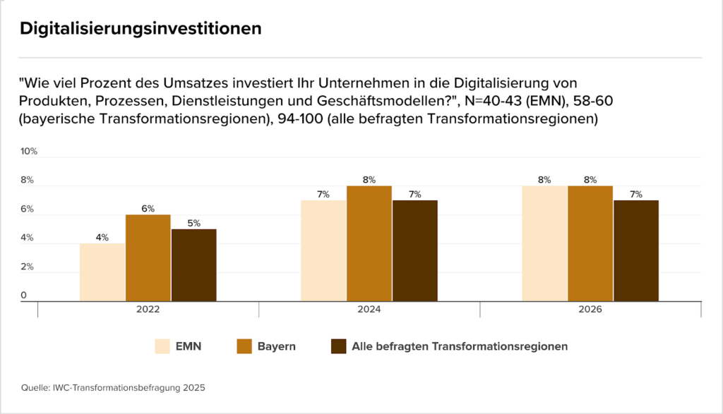 Die unten stehende Grafik aus dem Bericht verdeutlicht diese Entwicklung: In den EMN-Regionen steigen die Investitionen von 4 %(2022) auf 8 % im (2026). Bayern und andere Transformationsregionen liegen mit 7-8 % stabil im Mittelfeld. Die Werte belegen, dass die digitale Transformation ein fester Bestandteil der Ressourcenplanung ist. Für Unternehmen ist sie deshalb ein entscheidender Faktor, denn wer jetzt investiert, sichert sich die Innovationsbasis für die nächste Dekade.