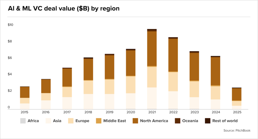 - Il settore del private capital affronta tre criticità emerse all’Ipem di Parigi: exit in difficoltà, sfida dell’intelligenza artificiale e rallentamento della raccolta. Secondo PitchBook, le exit sono calate per il secondo trimestre consecutivo nel 2025, con un crollo del valore dei disinvestimenti del 22,9% trimestre su trimestre e del numero di uscite dell’11,5%, mentre le mega-exit vivono il peggior anno dal 2019.