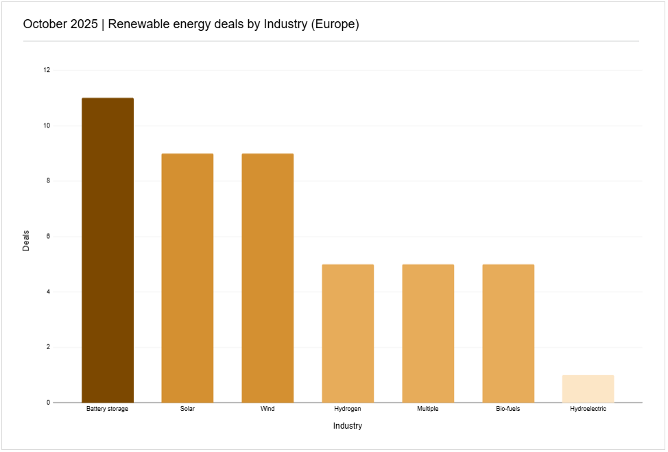 - Solar lost the crown, slipping from roughly 16 deals in September to 9 in October. Battery storage filled much of that gap, adding about 4 percentage points of share.