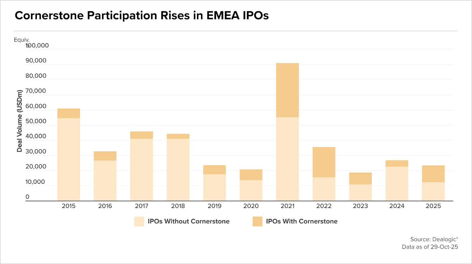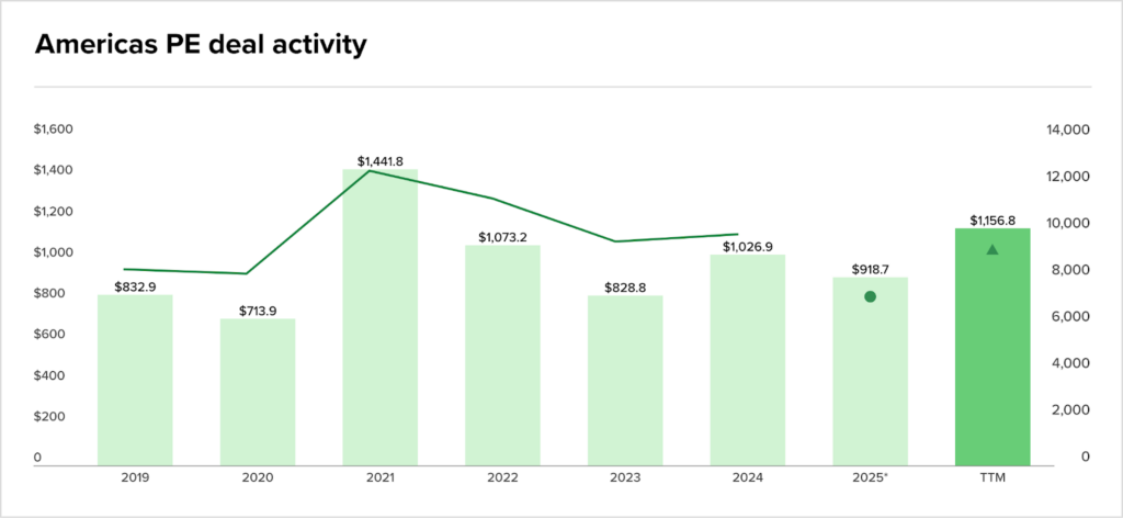 A atividade de deals em 2025 projeta fechar em torno de USD 918,7 bi (TTM Q3’25), abaixo dos USD 1,02 tri de 2024. O número de transações também segue em queda, com cerca de 9.000 deals no ano, longe dos 12.500 de 2021.