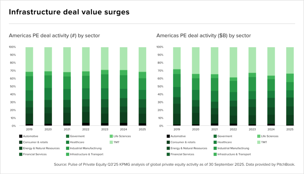 O gráfico abaixo mostra como Infrastructure & Transport mantém 15-20% do deal value de PE nas Américas entre 2019-2025, mostrando resiliência setorial enquanto TMT e Consumer & Retail perdem participação.