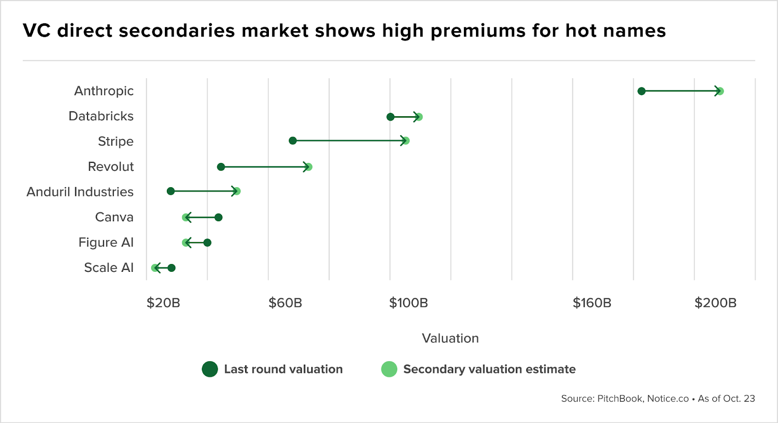 O gráfico mostra como o mercado secundário de VC mostra Anthropic, Databricks e Stripe negociando acima de últimos rounds primários, enquanto Scale AI e Canva aceitam descontos significativos versus valuations primários.