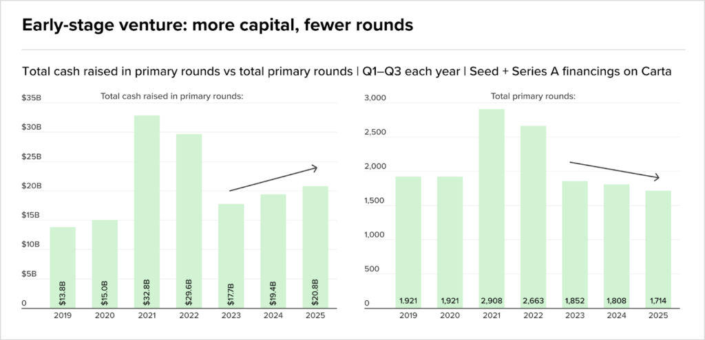 Os dados da Carta são brutais: em early-stage venture, o capital levantado cresceu de USD 17,7 bi (2023) para USD 20,8 bi (2025), mas o número de rounds despencou de 1.852 para 1.714 no mesmo período.