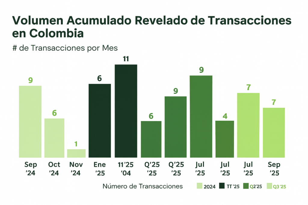 Seale & Associates presentó su nuevo reporte sobre M&A en Colombia en septiembre de 2025. En el país se registraron 3 transacciones, lo cual sigue reflejando una disminución en el número de deals, frente a 9 del año anterior. Sin embargo el panorama es optimista debido a que el volúmen es significativamente mayor a todo el capital movido en el año 2021.