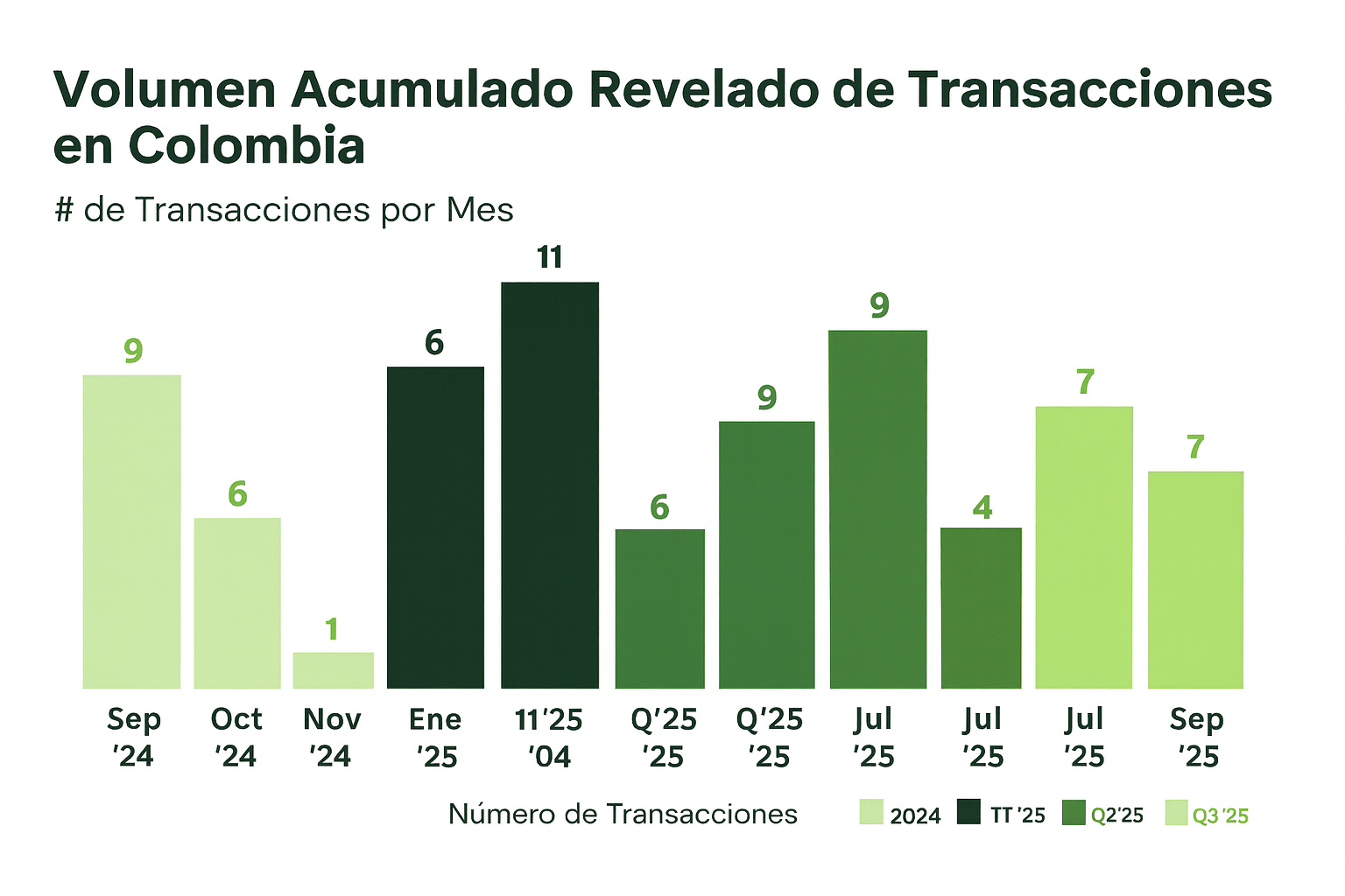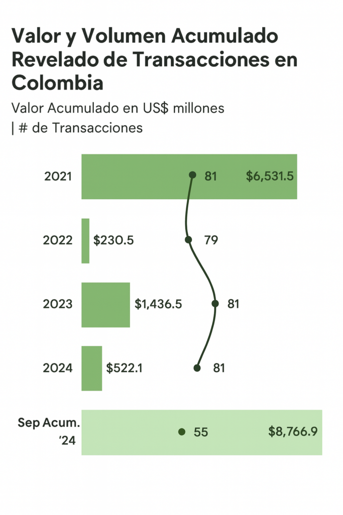 - Por su parte, el sector de servicios marítimos en Colombia vio una expansión transfronteriza, con SAAM acordando adquirir el 30,0% restante de la sociedad operativa Intertug (SAAM Towage Colombia SAS) por USD 30,5 millones, logrando el control total de sus operaciones de remolque.