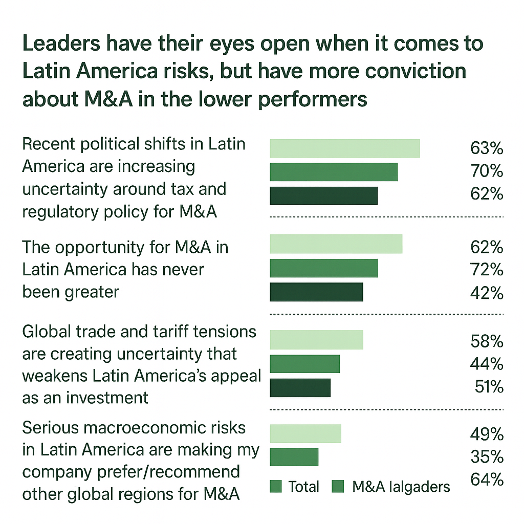 Los datos de KPMG muestran una brecha notable entre los líderes de M&A y las empresas rezagadas respecto a cómo perciben el riesgo en América Latina. Mientras la mayoría de los líderes ve oportunidades históricas (el 72% afirma que el momento para hacer M&A en la región nunca ha sido mejor) los rezagados mantienen una visión más defensiva y enfocada en la incertidumbre regulatoria, fiscal y macroeconómica.