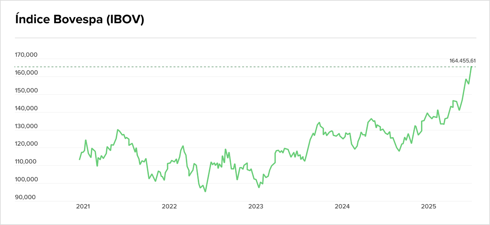O Ibovespa bateu recordes históricos na última semana, fechando acima dos 164 mil pontos com alta generalizada em quase todas as 82 ações da carteira. O otimismo veio embalado por um PIB do terceiro trimestre abaixo do esperado — o que, paradoxalmente, animou o mercado ao reforçar apostas de corte na Selic — e pela expectativa de afrouxamento monetário tanto aqui quanto nos Estados Unidos. “Há um apetite por risco renovado”, resumiu uma analista. A euforia é tanta que há quem aposte em Ibovespa a 171 mil pontos até o fim do ano.