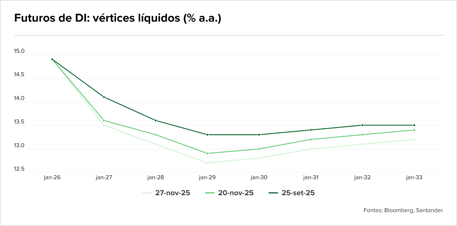 A curva de juros captou o recado. Os futuros de DI tiveram deslocamento para baixo ao longo de toda a estrutura, com a precificação indicando Selic ao redor de 12% no final de 2026 — ante 12,25% na semana anterior. A probabilidade de corte já em janeiro? 64%, segundo as últimas leituras. O mercado projeta início do ciclo de afrouxamento em breve, com Selic terminal de 2026 em 12,50%.