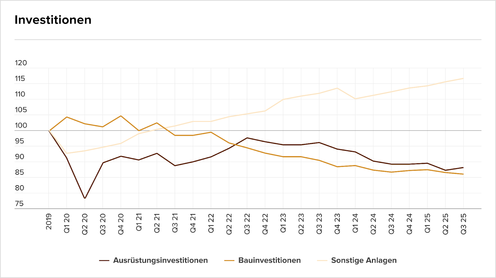 Parallel zur schwachen Konjunktur zeigt sich eine anhaltende Investitionszurückhaltung, die zunehmend zum strukturellen Problem wird. Besonders energieintensive Industrien und das Baugewerbe leiden unter hohen Kosten, Lieferengpässen und regulatorischer Unsicherheit. Diese Faktoren drücken auf die Fähigkeit der Wirtschaft, neue Wachstumsquellen zu erschließen.
