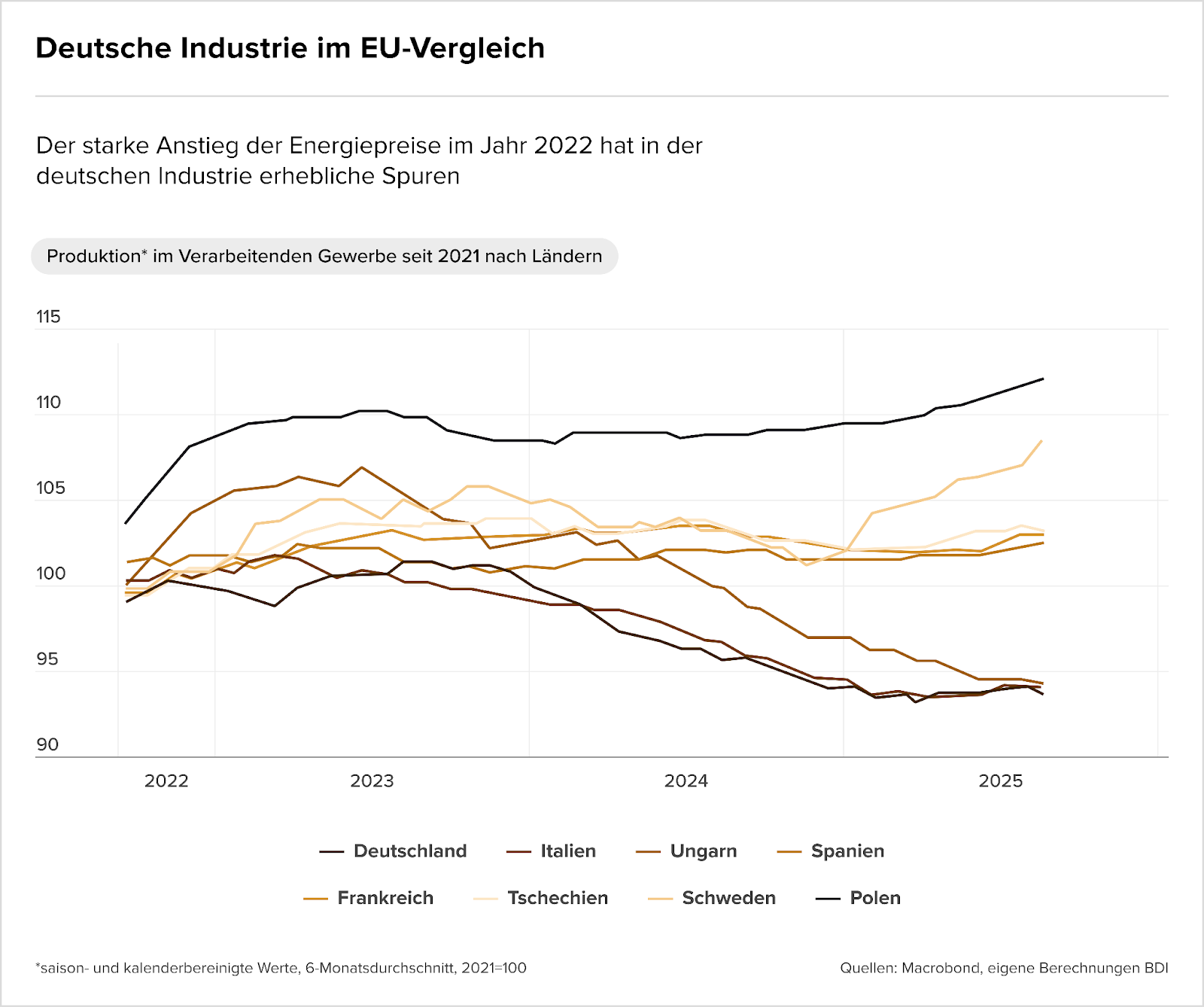 Das unten gezeigte BDI-Diagramm aus dem Industriebericht Dezember 2025 verdeutlicht diese Divergenz: Während Polen und Schweden ihre Industrieproduktion seit 2021 deutlich steigern, rutscht Deutschland kontinuierlich ab und bildet im EU-Feld inzwischen das Schlusslicht. Die Grafik illustriert somit, wie weit die Schere zwischen Deutschland und seinen Wettbewerbern inzwischen auseinandergeht und wie dringend strukturelle Reformen erforderlich sind.