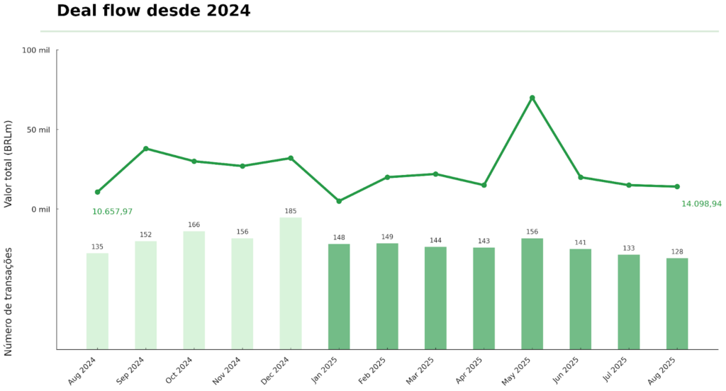 O casamento entre o estoque de IED e os números de M&A criam um cenário interessante: 1142 transações até agosto, um aumento de 5% em comparação com o mesmo período de 2024, e mais de BRL 187,8 bi movimentados, segundo a TTR.