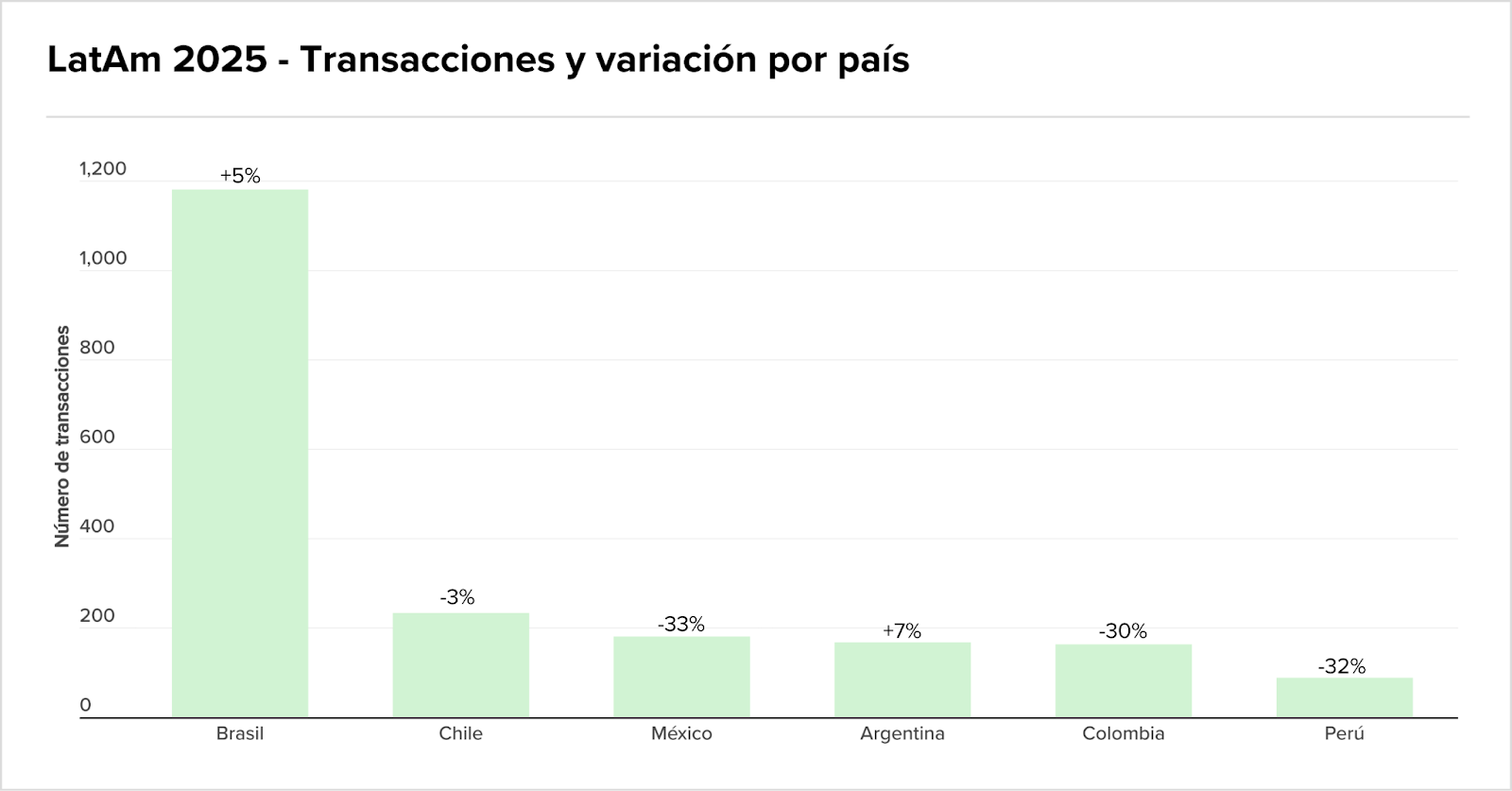 - Brasil lidera ampliamente con más de 1.100 transacciones y un crecimiento de +5%.