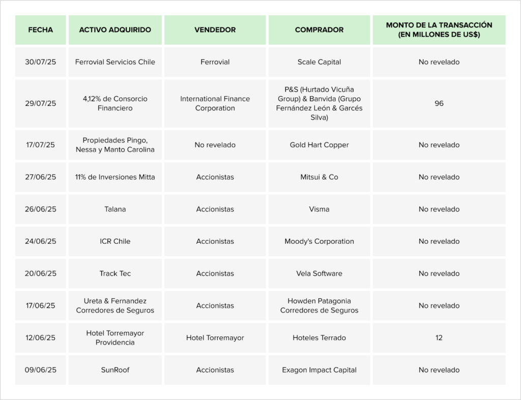 Otras transacciones relevantes, aunque sin monto revelado, incluyen la compra de Ferrovial Servicios Chile por Scale Capital, la adquisición de Talana por Visma, la incorporación de ICR Chile a Moody’s Corporation, la compra de TrackTec por Vela Software, y la inversión de Mitsui & Co. en Inversiones Mitta.