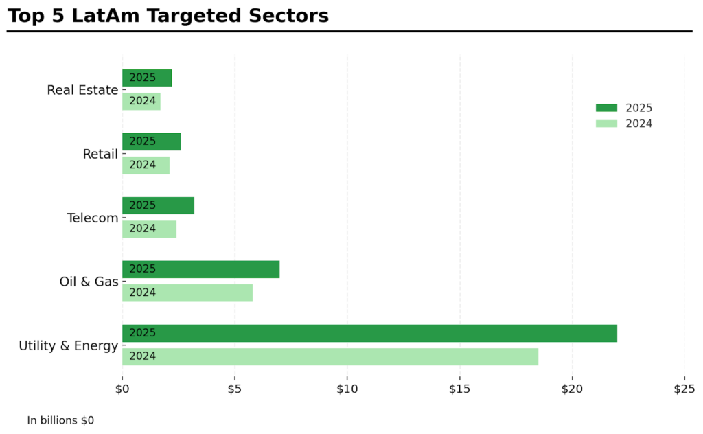 El sector de Utility & Energy lidera ampliamente con operaciones que superan los USDm 20, frente a los aproximadamente USDm 15 en 2024. Le sigue Oil & Gas, con un incremento moderado respecto al año anterior. Los sectores de Telecom, Retail y Real Estate también presentan actividad, aunque en volúmenes menores, todos por debajo de los USDm 5.