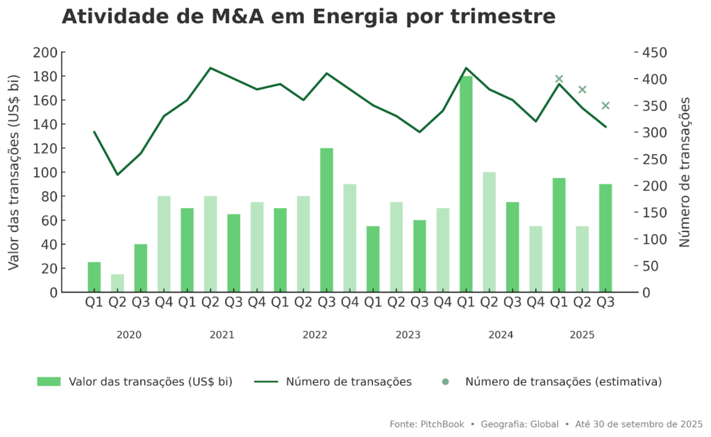 O resultado? O ano já caminha para fechar com alta tanto em número de operações quanto em valor. Só no terceiro trimestre, foram cerca de 375 deals somando USD 90,2 bi, levando o acumulado de 2025 para mais de 1.090 transações e USD 238 bi. A volta dos megadeals também ajudou a destravar o ritmo: Baker Hughes puxou a fila com a compra de USD 13,6 bi da Chart Industries, enquanto o consórcio liderado pela KKR aumentou sua fatia na Sempra Infrastructure em uma operação bilionária.