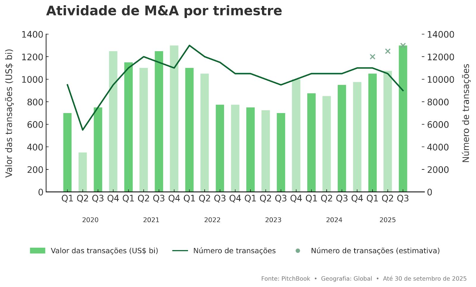 O M&A global entrou em 2025 tropeçando, mas não caiu. Depois de um Q2 que parecia prenúncio de retração, o Q3 virou o jogo com megadeals bilionários e uma retomada que ninguém apostava no começo do ano. O contraste é quase cômico: volatilidade para todo lado, petróleo instável, juros altos — e ainda assim, dealmakers não tiraram o pé.