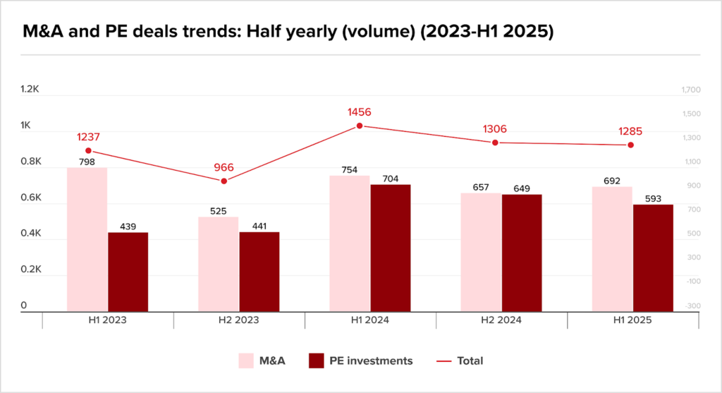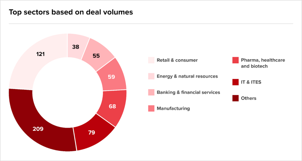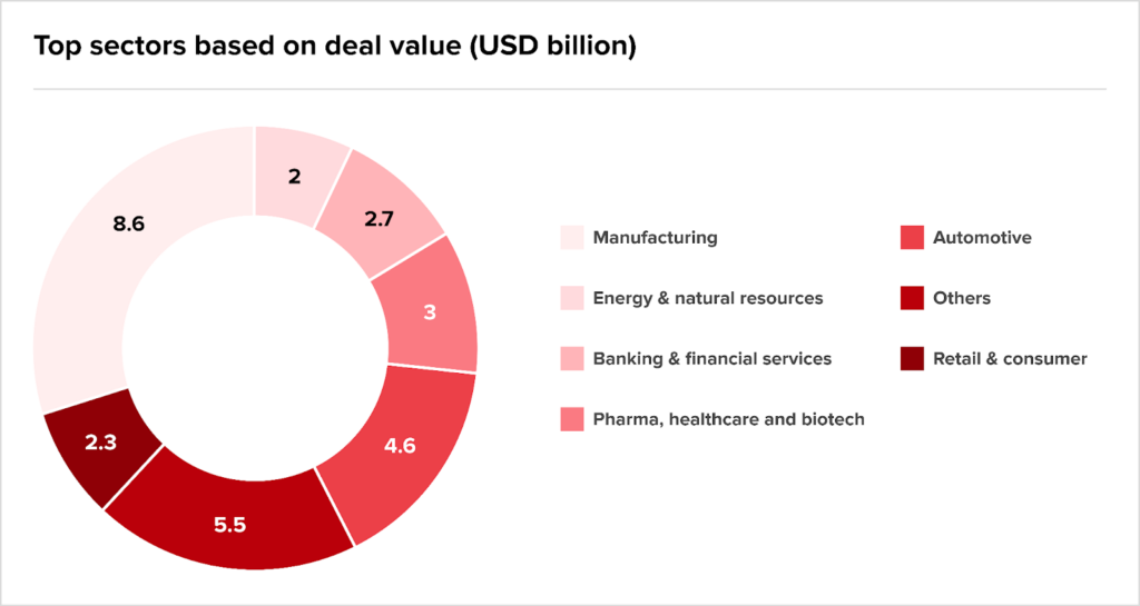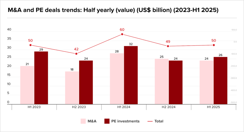 M&A in the same period showed overall deal value at $50.5 billion, with fewer but larger transactions dominating, a consolidation of deal value in fewer hands. A notable example: the Porteast–Shapoorji $3.1 billion deal.