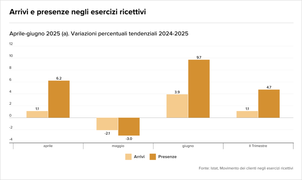 Il turismo italiano conferma la sua robustezza nel secondo trimestre 2025, con gli arrivi che segnano un +4,2% e le presenze un +3,1% rispetto allo stesso periodo del 2024. La crescita, trainata sia dal mercato domestico che da quello internazionale, evidenzia come il settore continui a essere un pilastro fondamentale dell’economia nazionale, nonostante le pressioni inflazionistiche. I dati ISTAT riflettono una domanda sostenuta, con destinazioni come le città d’arte e le località costiere che registrano performance particolarmente positive.