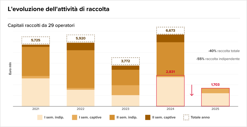 Il mercato italiano del private equity e venture capital vive un paradosso nel primo semestre del 2025: la raccolta di nuovi fondi è crollata del 40% attestandosi a soli 1,7 miliardi di euro, ma gli investimenti effettivi sono cresciuti del 17% toccando 5,2 miliardi. I dati Aifi-PwC evidenziano come il calo della raccolta, trainata per l’85% da capitali domestici, sia in parte compensato dall’ingente dry powder già disponibile. Nonostante il contesto, l’attività operativa rimane vivace con 370 deal conclusi (+24%), guidati dal segmento buyout (2,7 miliardi, +9%) e da un’explosion degli investimenti in infrastrutture (1,7 miliardi, +162%).