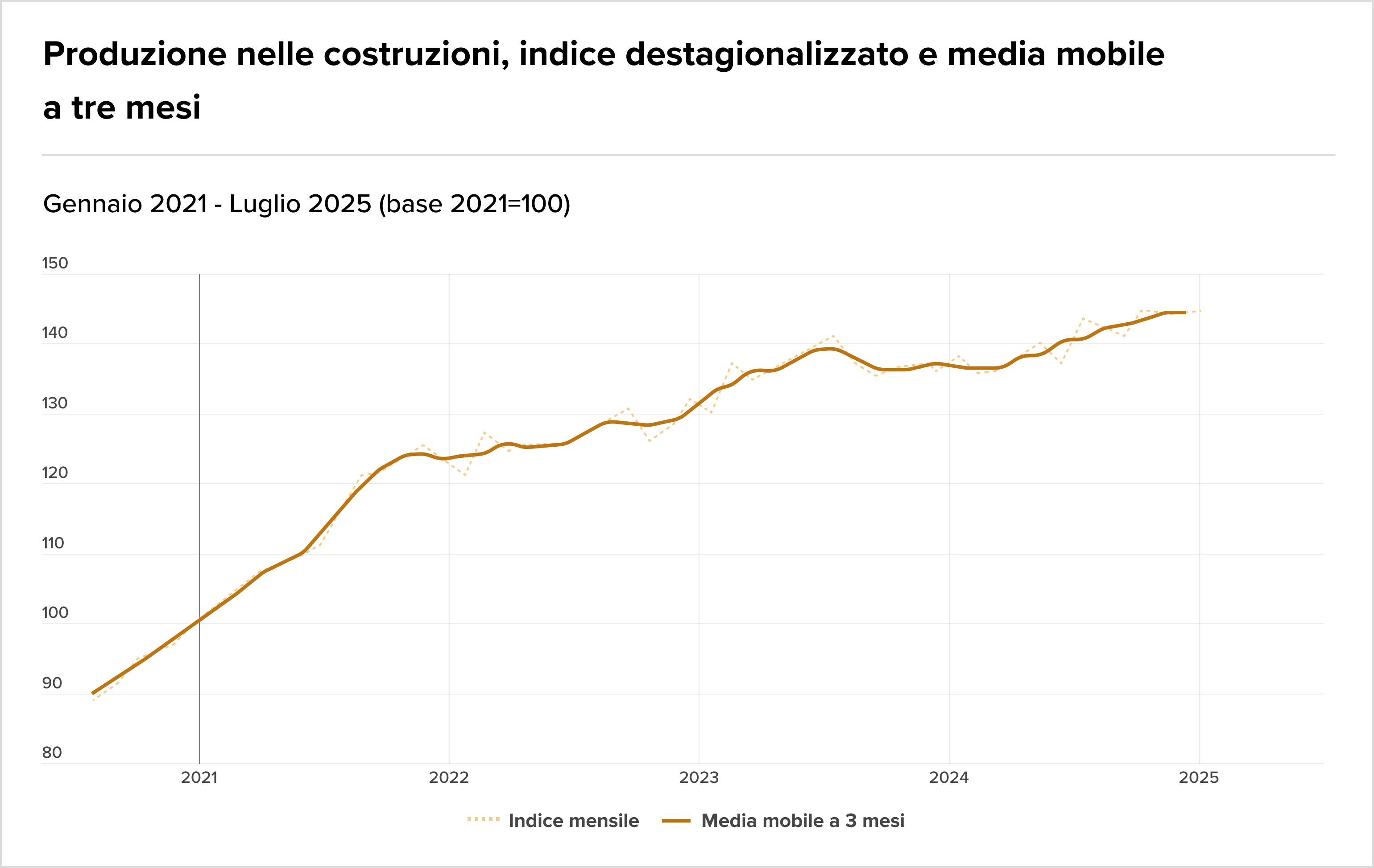 L’ISTAT segnala a luglio 2025 un calo congiunturale dello 0,8% della produzione nelle costruzioni, che interrompe una fase di crescita dopo il +1,1% di giugno. Nonostante il dato negativo mensile, il trend resta positivo con un incremento tendenziale del 2,3% sullo stesso mese del 2024, trainato principalmente dal segmento di ingegneria civile. Il dato conferma un andamento altalenante del settore, con una performance complessiva che rimane in territorio positivo su base annua.