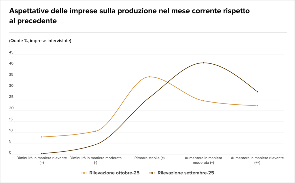 Il Centro Studi Confindustria rileva a ottobre un clima di fiducia ancora positivo ma in rallentamento tra le grandi imprese industriali italiane: il 46,3% prevede aumento della produzione, sostenuto dalla ripresa degli ordini (saldo +5,2% da zero). Persistono criticità su costi produttivi (saldo -4,2%), disponibilità materiali (-2,9%) e impianti (-0,4%), mentre le condizioni finanziarie restano solide (+1,5%) in un quadro complessivo favorevole ma con momentum in decelerazione.