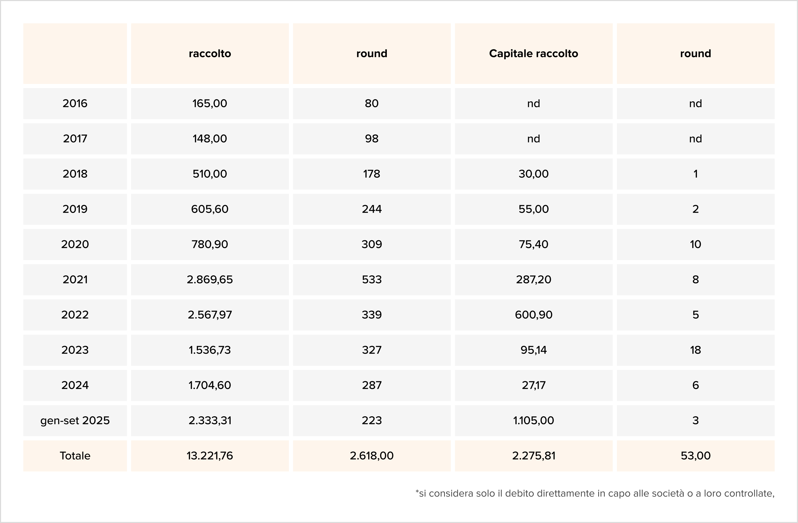 Le startup italiane hanno raccolto 2,3 miliardi di euro nei primi nove mesi del 2025, avvicinandosi già ai 1,7 miliardi dell’intero 2024, con un terzo trimestre da 835 milioni che conferma l’accelerazione del mercato. Il solo ottobre supera l’intero periodo gennaio-settembre grazie al mega-round di Bending Spoons da 710 milioni di dollari in equity e 2,8 miliardi in venture debt, destinato a ridisegnare le statistiche annuali del venture capital italiano.