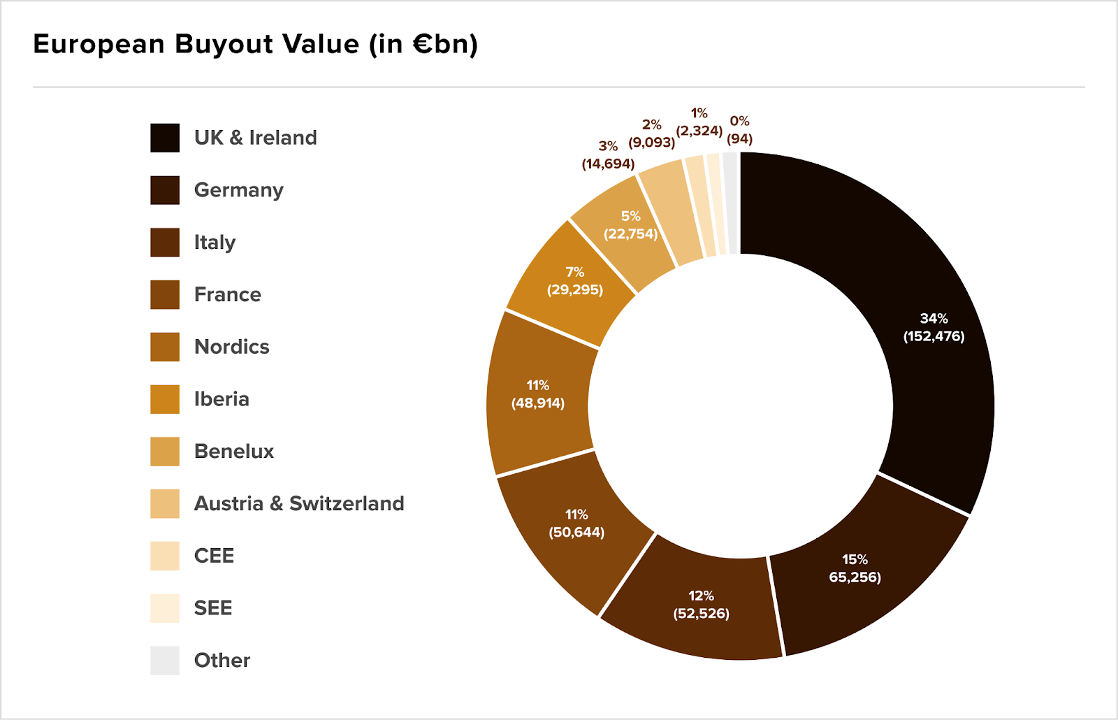 According to PwC’s PE Trend Report 2025 , the UK and Ireland retained their position as Europe’s largest buyout market, accounting for 34% of total PE deal value in 2024. A wave of LSE delistings, including the £4.2bn take-private of Darktrace and the £5.3bn delisting of Hargreaves Lansdown, opened doors for PE firms.