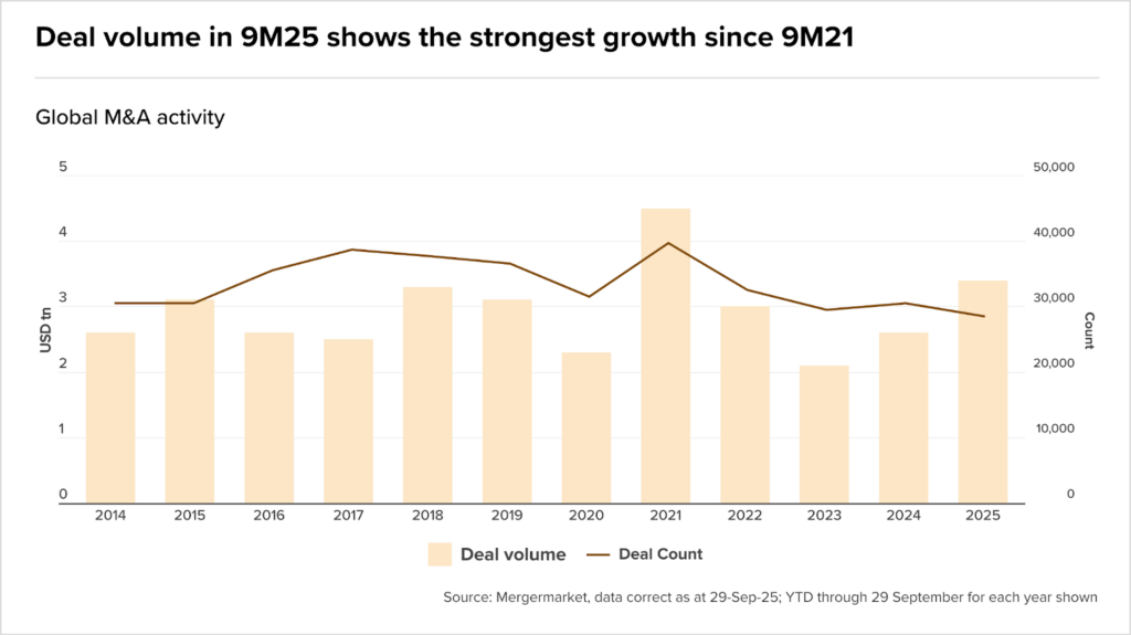 After a stuttering spring, global M&A volume surged 32% YoY to $3.4 trillion in 9M25. This marks the highest tally since 2021’s record run, states the newest Mergermarket analysis.
