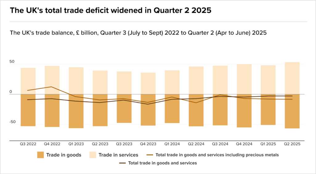 Official analysis of the Q2 2025 economic landscape shows that UK businesses are navigating complex cross-border challenges. According to the ONS, the account deficit has widened to 3.2% of GDP, driven primarily by a £7.7bn increase in the primary income deficit, while the trade picture shows mixed signals: goods exports fell £6.5bn even as services maintained strength with a £53.8bn surplus.