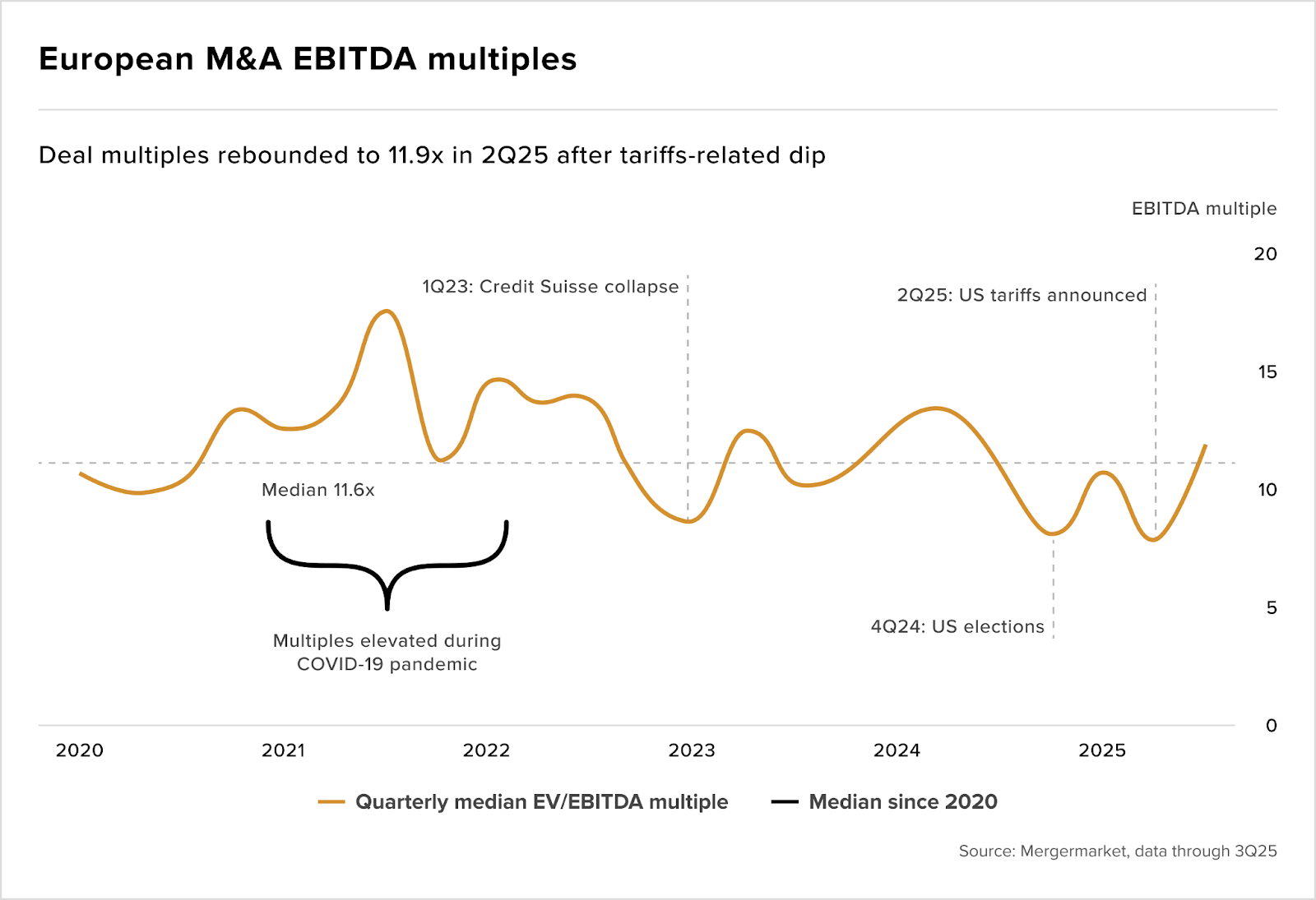 European dealmakers shook off their tariff jitters in Q3, driving EBITDA multiples from a second-quarter low of 7.9x back to a healthy 11.9x, comfortably in line with the five-year average of 11.6x, according to Dealogic.