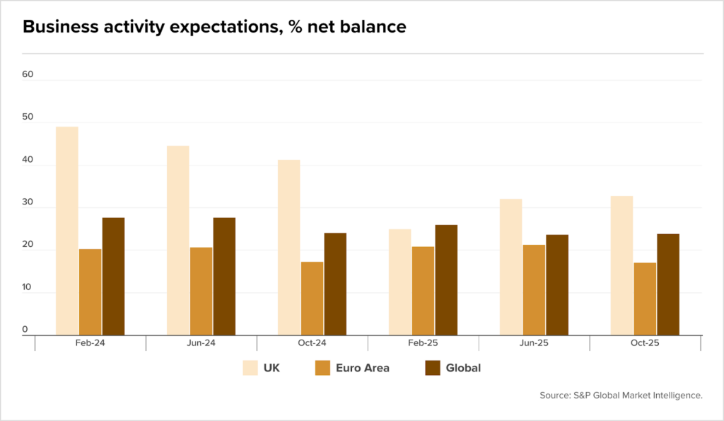 That said, UK businesses continue to outpace their European counterparts, with Euro area confidence falling to a 12-month low of +17%, while global sentiment holds steady at +24%. Services firms posted a net balance of +32%, slightly trailing manufacturing at +38%, though construction sector optimism weakened notably to its lowest level in three years at +17%.