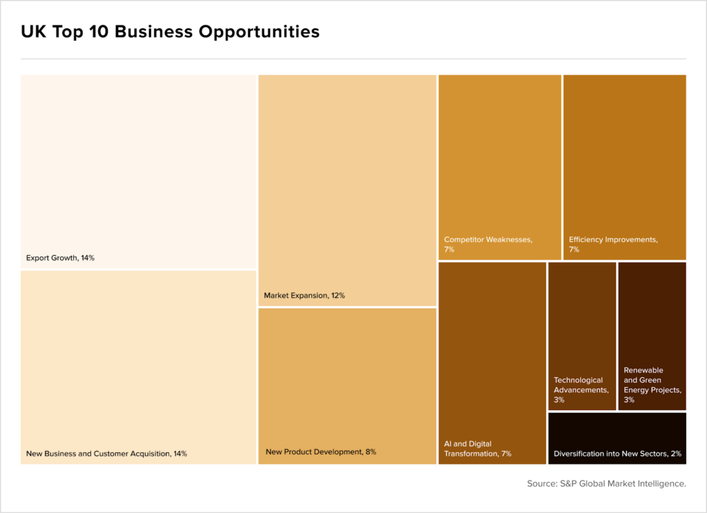 Looking at opportunity areas, UK firms identify new business acquisition (14%) and export growth (14%) as primary bright spots, followed by market expansion (12%) and product development (8%).